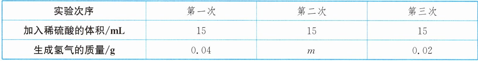 解析:(1)由表中数据可知,第一次加入15mL稀硫酸生成0.04g氢气,第三次加入15mL稀硫酸仍有氢气生成且只生成了0.02g氢气,这就说明直到第三次实验锌才完全反应,并且硫酸有剩余;所以第二次加入15mL稀硫酸时硫酸完全反应,生成氢气的质量仍为0.04g,故$m$的值为0.04。