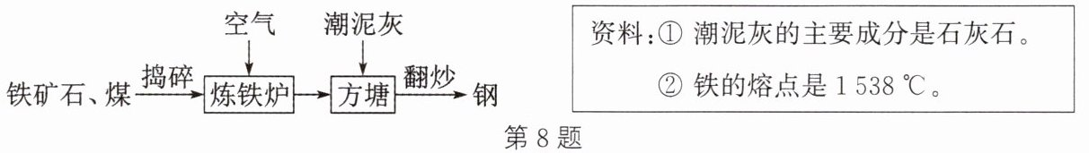 ,易于加工。答案:8. (1)磁铁矿(合理答案均可) (2)提供氧气,使燃烧更充分,提高炉温 (3) $\mathrm{Fe}_2\mathrm{O}_3 + 3\mathrm{CO} \xlongequal{\mathrm{高温}} 2\mathrm{Fe} + 3\mathrm{CO}_2$(合理答案均可) 一氧化碳(或$\mathrm{CO}$) (4)碳(或$\mathrm{C}$) (5)低