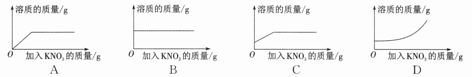 解:接近饱和的KNO₃溶液中原本含有一定质量的溶质,故初始溶质质量不为0。加入KNO₃固体时,溶质质量逐渐增加,直至溶液达到饱和状态后,溶质质量不再变化。符合此规律的图像为C。