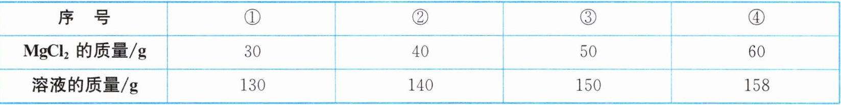 解:①中溶剂质量为$130g - 30g=100g$,$30g$氯化镁完全溶解;