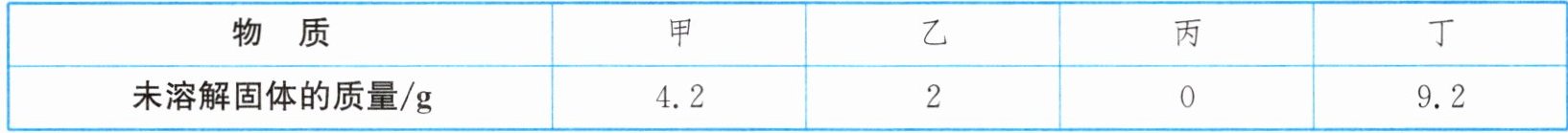 B.溶剂质量均为50g,丙未溶解固体质量为0,溶解溶质20g,甲溶解$20g - 4.2g=15.8g$,乙溶解$20g - 2g=18g$,丁溶解$20g - 9.2g=10.8g$,丙溶解溶质最多,B正确;