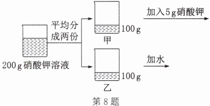 $g$。答案:8.(1)23.8% (2)300 解析:(1)甲烧杯中是100g溶质质量分数为20%的硝酸钾溶液,往甲烧杯中溶液内加入5g硝酸钾固体,完全溶解后,所得溶液的溶质质量分数为$\frac{100g × 20\% + 5g}{100g + 5g} × 100\% ≈ 23.8\%$。(2)乙烧杯中是100g溶质质量分数为20%的硝酸钾溶液,若要将乙烧杯中的溶液稀释成溶质质量分数为5%的硝酸钾溶液,设需加水的质量为x,则100g×20%=(100g + x)×5%,解得x=300g,故需加水300g。