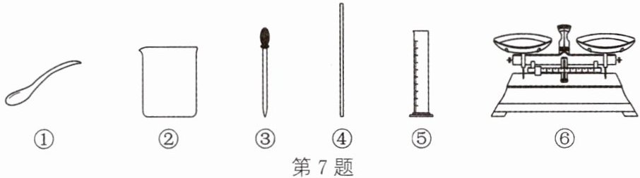7. (2025·成都)配制$50g$溶质质量分数为$6\%$的$NaCl$溶液,并用该溶液配制$50g$溶质质量分数为$3\%$的稀溶液,可能用到的仪器如图。下列说法正确的是 (