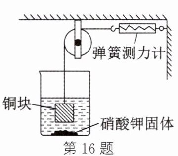 16. (跨学科融合)室温下,将一铜块悬挂在盛有含少量硝酸钾固体的饱和溶液的烧杯中(如图所示),另一端与弹簧测力计相连(铜块不参与反应),向烧杯中加入少量氢氧化钠固体,恢复至室温后,下列说法错误的是 (