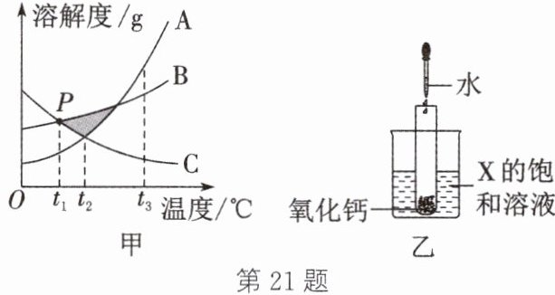 (填“A”“B”或“C”)物质。答案:21.(1)B (2)降温 (3)t₁℃时,B、C两种物质的溶解度相等 (4)B>C (5)C 解析:(1)阴影区域处于B物质的溶解度曲线下方,所以B的溶液处于不饱和状态。(2)A物质的溶解度随温度的升高而增大,C物质的溶解度随温度的升高而减小,所以若A的饱和溶液中含有少量的C,提纯A的方法为降温结晶,过滤。(3)通过分析溶解度曲线可知,P点表示的含义为t₁℃时,B、C两种物质的溶解度相等。(4)B物质的溶解度随温度的升高而增大,C物质的溶解度随温度的升高而减小,t₁℃时B物质的溶解度>t₂℃时C物质的溶解度,所以t₁℃时,若将B、C两种物质的饱和溶液升温至t₂℃,所得溶液的溶质质量分数的大小关系为B>C。(5)向题图乙的试管中滴入2mL水后,氧化钙和水反应放热,若X的饱和溶液中有固体析出,则X为溶解度随温度的升高而减小的物质,即C物质。