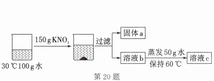 (填“饱和”或“不饱和”)溶液。答案:20.(1)氯化钾(或KCl) (2)增大 (3)28.6% (4)①104.2 ②不饱和 解析:(3)40℃时,KCl的溶解度为40.0g,故其饱和溶液的溶质质量分数为$\frac{40.0g}{100g + 40.0g} × 100\% ≈ 28.6\%$。(4)①30℃时,硝酸钾的溶解度为45.8g,即100g水中最多溶解45.8g硝酸钾固体,所以过滤得到固体a的质量为150g - 45.8g=104.2g。②溶液b为30℃时KNO₃的饱和溶液,其中溶质的质量为45.8g,溶剂的质量为100g,此时,蒸发50g水,溶剂的质量变为50g,当温度为60℃时,硝酸钾的溶解度为110g,则50g水中最多可溶解硝酸钾的质量为$\frac{110g}{2} = 55g>45.8g$,故此时得到的溶液c为不饱和溶液。