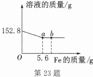23. (2024·牡丹江)“信州铅山县有苦泉,流以为涧。挹其水熬之,则成胆矾,烹胆矾则成铜。熬胆矾铁釜,久之亦化为铜。”——沈括《梦溪笔谈》。兴趣小组根据其中的原理进行了如下实验,向$152.8g$硫酸铜溶液中加入铁粉,所得实验数据如图所示。
