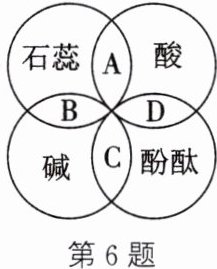 6. 某同学在学习酸碱指示剂与常见酸、碱溶液作用时,归纳了物质间的关系如图所示。图中 A、B、C、D 分别表示指示剂与酸、碱溶液作用时所显示出的颜色,其中不正确的是(