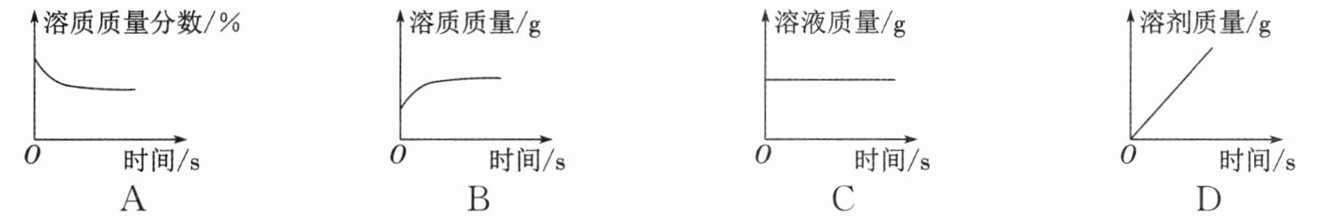 溶液质量因溶剂增加而增大,图像C中溶液质量不变,错误。