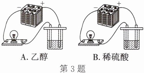 3. 某学习小组进行了如图所示的实验,分别试验乙醇、稀硫酸的导电性,请回答下列问题。