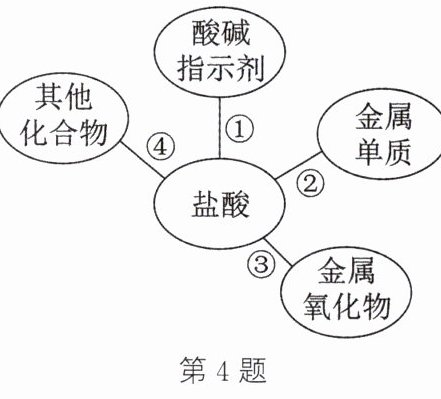 4. (2024·西安段考)归纳是学习化学的重要方法,小红在复习盐酸的性质时,归纳出盐酸的4条化学性质(如图所示,连线表示相互能发生化学反应)。