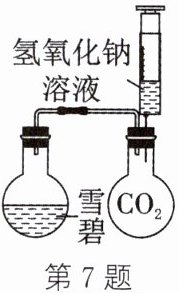 答案:7.D 解析:推入氢氧化钠溶液并振荡后,氢氧化钠与二氧化碳反应生成碳酸钠和水,气体减少,压强减小,气体的溶解度减小,雪碧中溶解的二氧化碳逸出,会观察到雪碧中出现大量气泡,A正确;氢氧化钠与 SO₂ 反应生成 Na₂SO₃ 和水,也会使压强减小,出现同样现象,B正确;压强越小,气体的溶解度越小,该装置可证明气体的溶解度受压强的影响,C正确;氨水也是一种碱溶液,能与二氧化碳反应,同样能使装置中的压强减小,实验能成功,D错误。