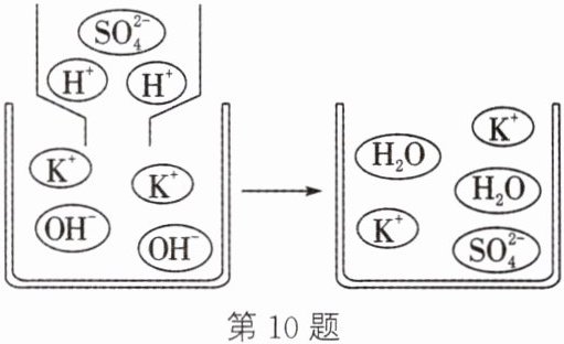 答案:10. (1) 氢氧化钾与稀硫酸反应 (2) 红色逐渐变为无色 (3) 氢离子与氢氧根离子结合生成水分子 (4) $\mathrm{H_2SO_4 + 2KOH \xlongequal\ K_2SO_4 + 2H_2O}$ (5) 反应物消失 (6) ④⑤