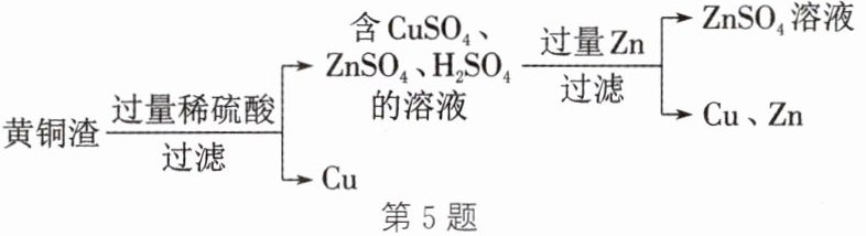5. (2024·连云港)一种以黄铜渣(含 Zn、Cu、ZnO、CuO)为原料获取 Cu 和 ZnSO₄溶液的实验流程如图。下列说法正确的是(