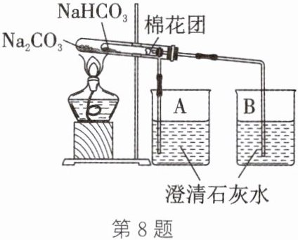 (用化学方程式表示)。答案:8.【实验过程】(1)$2NaHCO_{3}\xlongequal{\triangle}Na_{2}CO_{3}+H_{2}O + CO_{2}\uparrow$ (2)B 【实验拓展】$NaHCO_{3}+HCl = NaCl + H_{2}O + CO_{2}\uparrow$