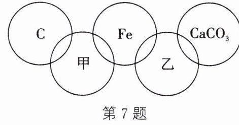 7. 如图所示,甲、乙分别是$ \mathrm{O}_2 $、$ \mathrm{Fe}_2\mathrm{O}_3 $、稀盐酸三种物质中的一种,“五环”中相交两环中的物质间能够发生化学反应。