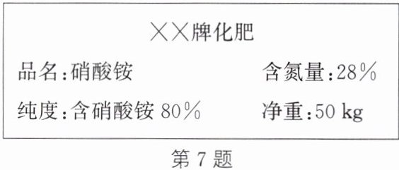 答案:7. C 解析:这袋化肥中氮元素的质量为 50 kg×28% = 14 kg, A 错误;硝酸铵中氮元素的质量分数为$\frac{14 × 2}{14 × 2 + 1 × 4 + 16 × 3} × 100% = 35%,$这袋化肥中氮元素的质量为 14 kg,则该化肥中硝酸铵的质量分数为$\frac{14 kg}{35% × 50 kg} × 100% = 80%,$若该化肥所含杂质中不含氮元素,则标签中的纯度真实,B 错误;需施用尿素[CO(NH₂)₂]60 kg,要达到相同的肥效则需施用该化肥的质量为$\frac{60 kg × (\frac{14 × 2}{12 + 16 + 14 × 2 + 1 × 4} × 100%)}{28%} = 100 kg,$C 正确;氮肥主要促进植物茎、叶生长茂盛,使叶色浓绿,磷肥主要增强作物的抗寒、抗旱能力,D 错误。