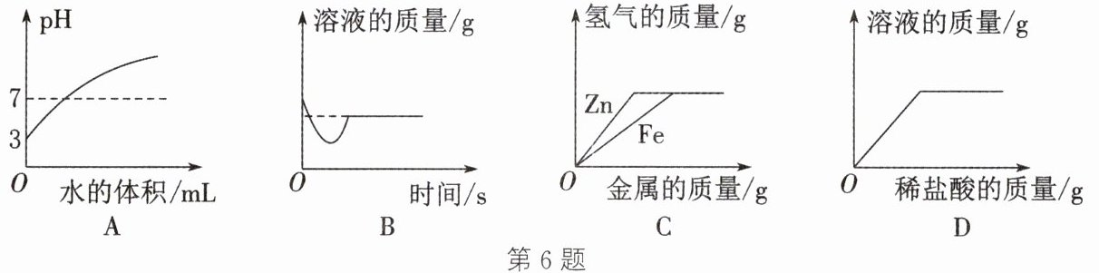 答案:6.B 解析:常温下,向$pH=3$的某溶液中加水稀释,酸性溶液加水稀释,酸性减弱,$pH$逐渐增大至无限接近7,但不会等于7,更不会大于7,A不正确;向一定质量的氢氧化钙饱和溶液中加入少量氧化钙固体,氧化钙与水反应生成氢氧化钙,导致部分水被消耗,溶液中有氢氧化钙析出,且该反应放出热量,溶液温度升高,氢氧化钙的溶解度随温度升高而减小,也会导致氢氧化钙结晶析出,使得溶液质量减小,待完全反应后,溶液温度逐渐冷却至室温,温度降低,氢氧化钙的溶解度增大,部分氢氧化钙又溶于水,导致溶液质量又略有增大,但由于消耗了水,且有氢氧化钙析出,所以最终溶液的质量小于原来溶液的质量,B正确;向质量和质量分数都相同的稀盐酸中分别加入锌和铁,锌和稀盐酸反应的化学方程式及部分物质间的质量关系为$Zn + 2HCl \xlongequal\ ZnCl_2 + H_2\uparrow$,铁和稀盐酸反应的化学方程式及部分物质间的质量关系为$Fe + 2HCl \xlongequal\ FeCl_2 + H_2\uparrow$,故一开始,金属的量不足,酸过量,铁生成氢气的质量比锌大,后来酸不足,金属过量,生成氢气的总质量相等,C不正确;向一定质量的氧化镁固体中逐渐加入稀盐酸,氧化镁和稀盐酸反应生成氯化镁和水,溶液的质量逐渐增大,待完全反应后,继续加入稀盐酸,溶液的质量还是继续增大,但是增大幅度变小,D不正确。