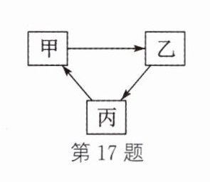 )答案:17. C 解析:铜和氧气在加热条件下反应生成氧化铜,氧化铜和酸反应生成水,水通电分解生成氧气,故A不符合题意;二氧化碳和氢氧化钠反应生成碳酸钠,碳酸钠和氢氧化钙反应生成碳酸钙沉淀,碳酸钙和稀盐酸反应生成二氧化碳,故B不符合题意;氢氧化铜不能一步转化成铜,故C符合题意;氢氧化钙和碳酸钠反应生成氢氧化钠,氢氧化钠和二氧化碳或酸反应生成水,水和氧化钙反应生成氢氧化钙,故D不符合题意。