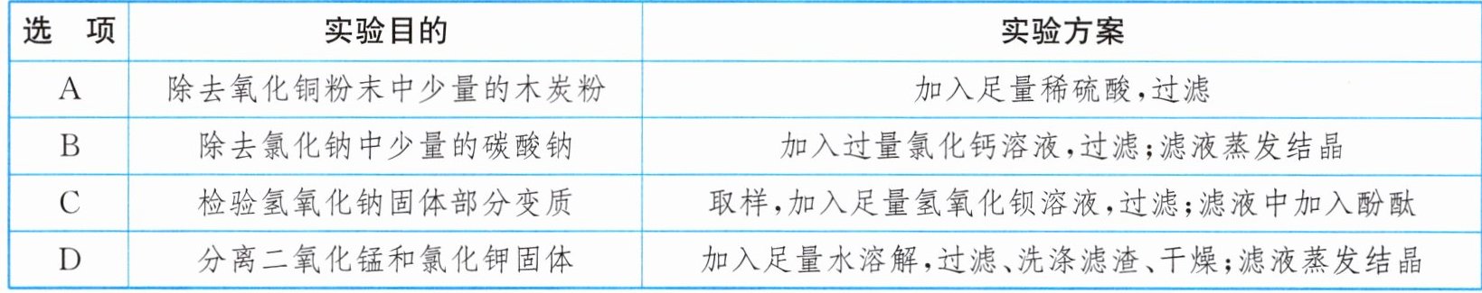 )答案:16. D 解析:氧化铜能与稀硫酸反应生成硫酸铜和水,会将主要物质除去,A不能达到实验目的。碳酸钠能与过量的氯化钙溶液反应生成碳酸钙沉淀和氯化钠,能除去杂质但引入了新的杂质氯化钙(过量的),不符合除杂原则,B不能达到实验目的。变质后的氢氧化钠中含有碳酸钠,取样,加入足量氢氧化钡溶液,碳酸钠和氢氧化钡反应生成碳酸钡沉淀和氢氧化钠,由于有氢氧化钠生成,加入酚酞后,滤液一定会变红,不能检验氢氧化钠固体是部分变质还是全部变质,C不能达到实验目的。KCl易溶于水,$\mathrm{MnO}_2$难溶于水,可加入足量水溶解,过滤、洗涤滤渣、干燥,分离出二氧化锰;将滤液蒸发结晶,再分离出氯化钾,D能达到实验目的。