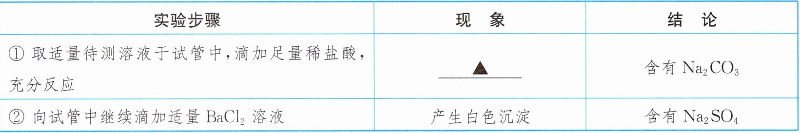 。答案:【跨学科实践活动9】1. (1) 减小测量误差,避免偶然性 (2) 碱 (3) 有气泡产生 (4) $\mathrm{Na}_2\mathrm{SO}_4 + \mathrm{BaCl}_2 \longrightarrow \mathrm{BaSO}_4 \downarrow + 2\mathrm{NaCl}$ (5) $\mathrm{Na}_2\mathrm{CO}_3$、$\mathrm{Na}_2\mathrm{SO}_4$ (6) 酸 (7) 赞同,盆土中含有碳酸钠,碳酸钠溶液呈碱性