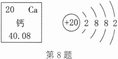 8. 钙元素可以通过蛋黄、骨汤等食物被人体摄人,它在人体中的主要存在形式是羟基磷酸钙[Ca₁₀(PO₄)₆(OH)₂]。如图是钙元素在元素周期表中的部分信息及原子结构示意图。请回答: