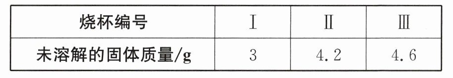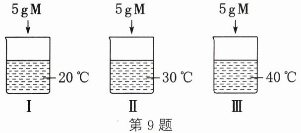 答案:9.B 解析:将5g固体M分别投入盛有不同温度的10g水的烧杯中,充分溶解后,均有固体剩余,由表格数据可知,温度越高,剩余的固体越多,则M的溶解度随着温度的升高而减小,A错误。20℃时,10g水中最多能溶解M的质量为5g−3g=2g,则20℃时,100g水中最多能溶解M的质量为20g,即20℃时,M的溶解度为20g,B正确。烧杯Ⅰ中,溶质的质量分数为$\frac{2g}{2g + 10g}×100\%≈16.7\%,$C错误。将Ⅰ、Ⅱ两个烧杯中的溶液分别升温至40℃,M的溶解度随着温度的升高而减小,由于20℃和30℃时M的溶解度不相等,则此过程中,析出的固体质量不相等,D错误。