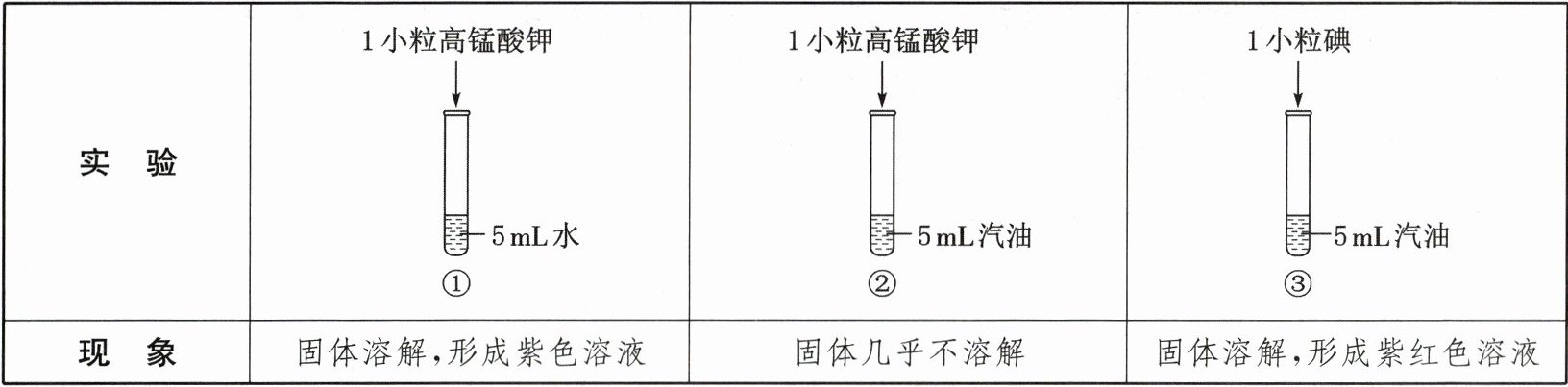 D.对比实验①②③的现象,说明水和汽油可以溶解所有物质