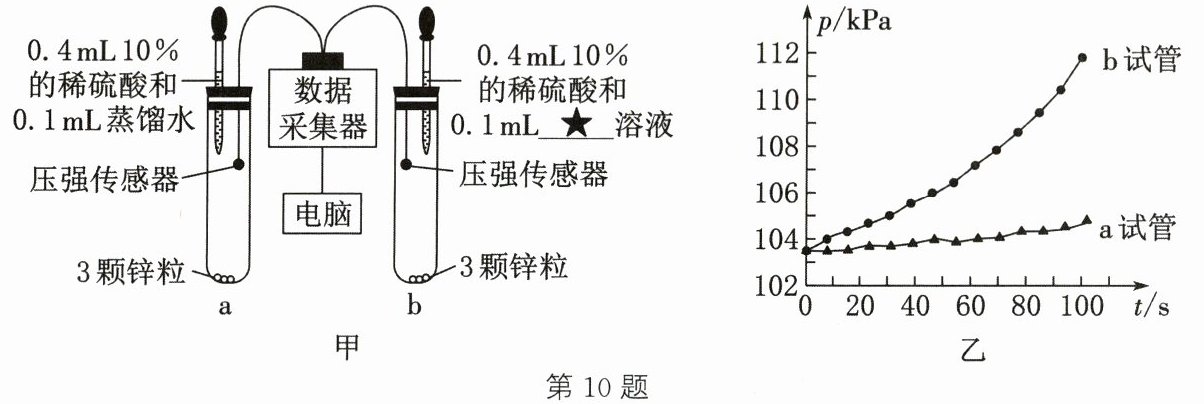 10. 为探究硫酸铜溶液对锌和稀硫酸反应速率的影响,学习小组利用图甲装置和试剂进行实验。试管中挤入溶液后,立即开启数据采集器,测得 100s 内压强(p)与时间(t)的关系如图乙。下列说法不正确的是(