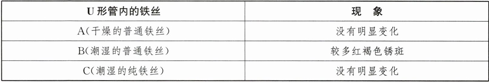 步骤 2:一段时间后,观察 U 形管内的铁丝现象如表所示。