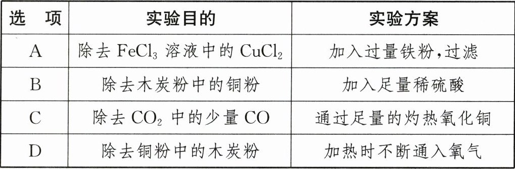 )答案:13.C 解析:加入过量铁粉,氯化铁和氯化铜都能与铁反应,不符合除杂原则,A不能达到实验目的;铜粉、木炭粉与稀硫酸均不反应,不符合除杂原则,B不能达到实验目的;通过灼热的氧化铜,一氧化碳能与灼热的氧化铜反应生成铜和二氧化碳,符合除杂原则,C能达到实验目的;铜粉和木炭粉在加热的条件下都会与氧气反应,不符合除杂原则,D不能达到实验目的。