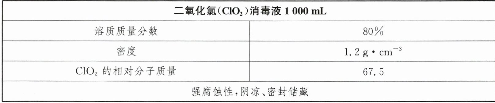 解析:(1)二氧化氯消毒液的密度为1.2g·cm⁻³,1000mL(1000cm³)二氧化氯消毒液的质量是1.2g·cm⁻³×1000cm³=1200g,其中溶质的质量为1200g×80%=960g。