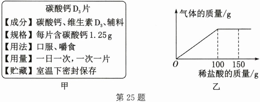 25. (7 分)如图甲是碳酸钙 D₃片标签的部分信息。化学社团为测定每片药片中碳酸钙的质量是否与标签相符,进行实验:取 8 片药片,研碎后逐渐加入溶质质量分数为 7.3%的稀盐酸,充分反应。实验相关数据如图乙所示(假设其他成分不参加反应)。