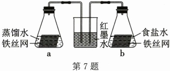 7. 将两张相同的铁丝网置于两个相同大小的锥形瓶中,分别倒入等体积的蒸馏水和食盐水,立即旋紧橡胶塞,将导管伸入滴有红墨水的水中。一段时间后,观察到烧杯中的导管内液面上升,且右侧导管内液面上升幅度较大,锥形瓶 b 中的铁丝网比 a 中的铁丝网锈蚀更严重。下列相关说法不正确的是(
