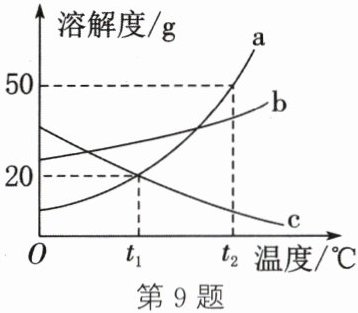 答案:9.C 解析:由于a的溶解度随温度的降低而减小,使a的饱和溶液析出晶体可以采用降温结晶的方法,由于c的溶解度随温度的降低而增大,使c的饱和溶液析出晶体可以采用升温结晶的方法,A错误;t₁℃时,a、c两种物质的溶解度相等,此温度下a、c的饱和溶液的溶质质量分数一定相等,若溶液不饱和,则溶液的溶质质量分数关系不能确定,B错误;t₂℃时,a、b、c三种物质的溶解度的大小关系是a>b>c,由饱和溶液的溶质质量分数=$\frac{溶解度}{100g+溶解度} × 100\%$可知,饱和溶液的溶质质量分数由大到小的关系是a>b>c,C正确;t₂℃时,a物质的溶解度是50g,将30ga物质加入50g水中充分溶解,只能溶解25g,所得溶液的质量为50g+25g=75g,D错误。