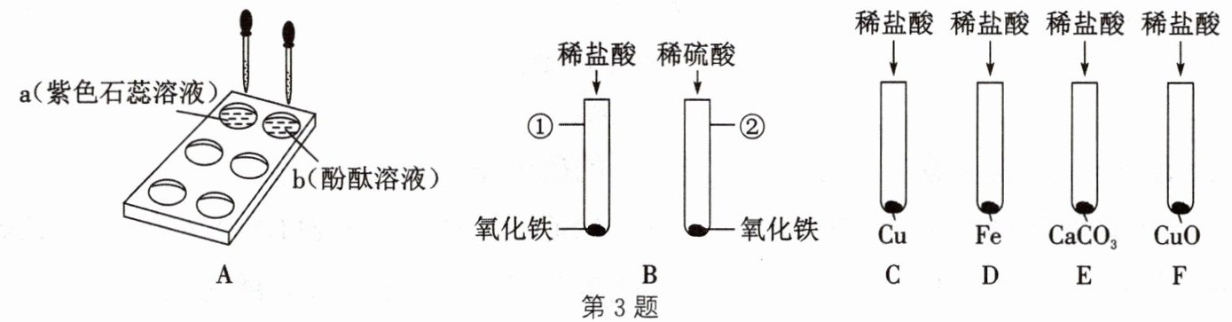 。答案:3.(1)C F (2)a 化学 节约试剂(合理答案均可) (3)固体溶解,溶液由无色变为黄色 (4)有气泡产生,固体逐渐减少,溶液由无色变为浅绿色 Fe+2HCl══FeCl₂+H₂↑ (5)CaCO₃+2HCl══CaCl₂+H₂O+CO₂↑ 澄清石灰水(或氢氧化钙溶液)