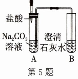 (填化学式)。答案:5.(1)$\mathrm{Na_2CO_3 + 2HCl = 2NaCl + H_2O + CO_2\uparrow}$ (2)盐酸与碳酸钠反应生成了二氧化碳气体,试管内气体增多,压强增大,将A中的溶液压入B中 (3)$\mathrm{CaCO_3}$