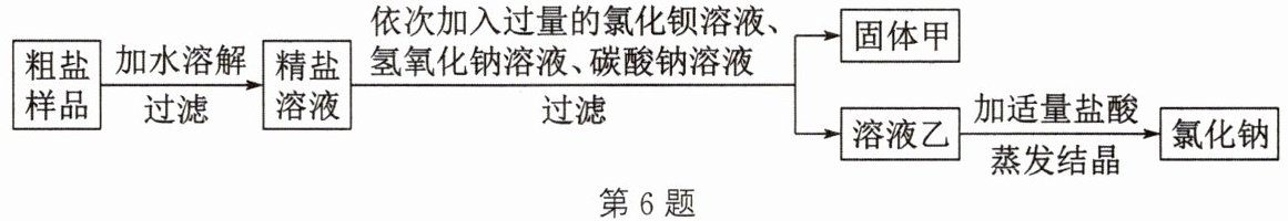 6. 粗盐中除含泥沙等不溶性杂质外,还含有少量的可溶性杂质(如 $ MgCl_2 $、$ CaCl_2 $、$ Na_2SO_4 $ 等)。工业上,以粗盐为原料制取氯化钠的生产流程如图所示。下列说法正确的是(