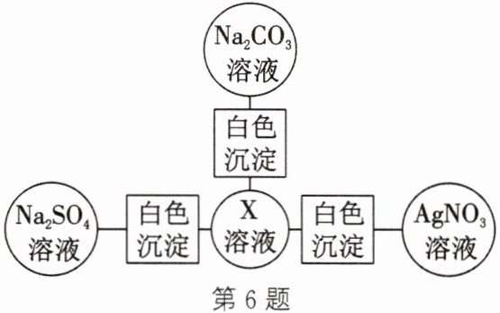 6. 如图所示,X溶液与$ {AgNO_{3}} $、$ {Na_{2}CO_{3}} $、$ {Na_{2}SO_{4}} $三种溶液发生反应均生成白色沉淀。X溶液可能是(