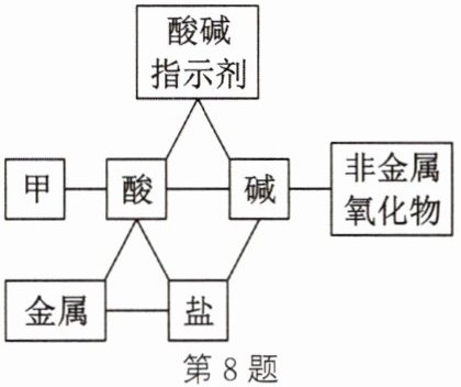 8. 如图为酸和碱的化学性质思维导图,请回答下列问题。(“—”表示相连的两类物质之间可以发生化学反应)