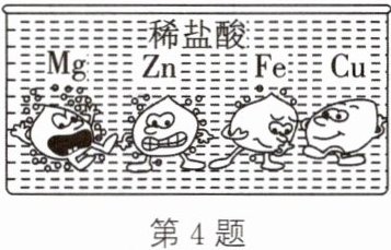 4. 如图是取大小、形状相同的Mg、Zn、Fe、Cu四种金属放入相同浓度的稀盐酸中的状况的示意图。仔细观察并结合所学的知识回答下列问题:
