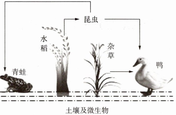 3. 下页图为某学校一个生物兴趣小组的同学,通过对一个稻田生态系统的观察,发现稻田里主要的生物有:水稻、昆虫、青蛙、鸭等。他们根据其营养关系,绘制出该稻田生态系统示意图。请结合所学知识回答问题。