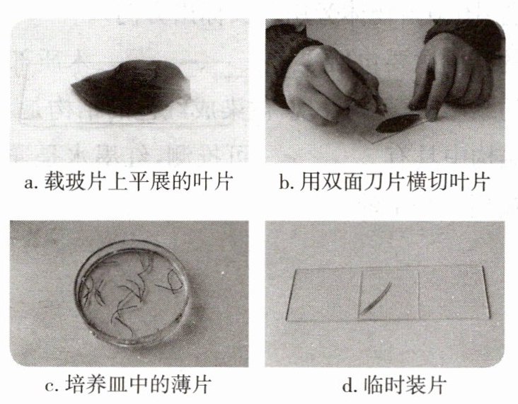 叶片,多切几次(每切一次,刀片要蘸水一次)。3. 用镊子夹取切下的薄片放入盛有