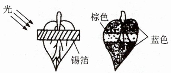3. (单选题)下图表示暗处理后,将某植物的绿叶经阳光照射24h后,脱色并用碘液处理,结果不被锡箔覆盖的部位呈蓝色,锡箔覆盖的部位不呈蓝色。该实验可证明(