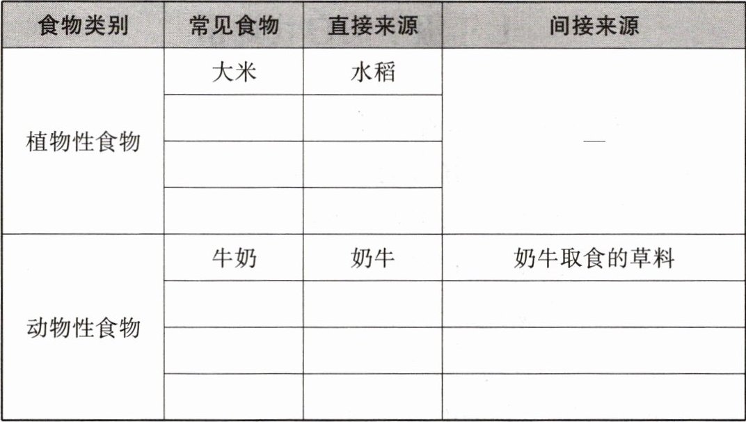 小组同学讨论调查的常见食物来源。各小组相互交流,进一步理解植物能够为其他生物提供有机物。