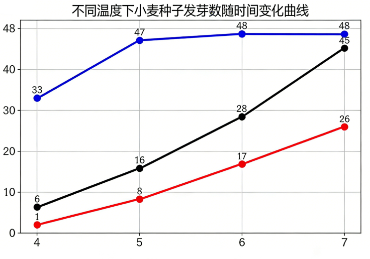 (1)以横坐标表示时间(天)、纵坐标表示发芽数(粒)绘制坐标图,并在坐标中用红、黑和蓝三色(或不同线的类型)绘出种子萌发情况的曲线。