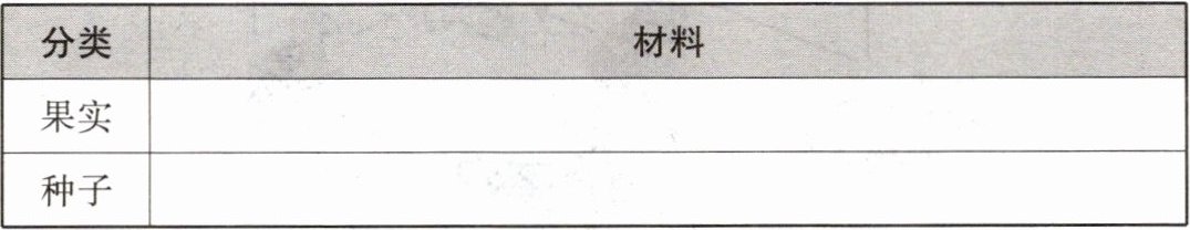 6. 植物的果实和种子与我们的生活关系密切,但果实和种子特别容易混淆。尝试区分下列材料是果实还是种子,并将它们填入下表中。