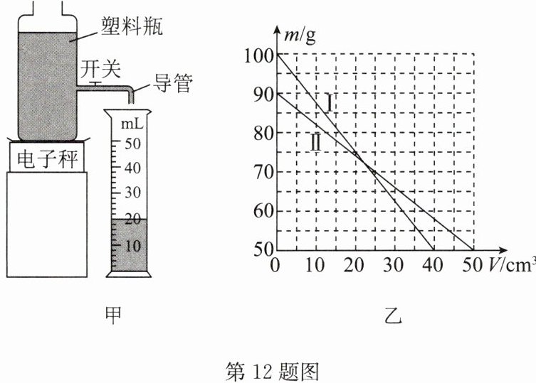 12. 某实验小组用如图甲所示装置研究液体密度,打开开关,塑料瓶中液体通过导管缓慢流入量筒中,记录电子秤与量筒液面示数变化如图乙所示,下列分析正确的是(