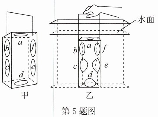 5. (2025·苏州) 如图甲, 在透明密闭塑料盒的上下左右四个面上开了六个相同圆孔, 在孔的位置蒙上相同的橡皮膜 a、b、c、d、e、f, 将它压入水中后, 出现如图乙所示的现象.