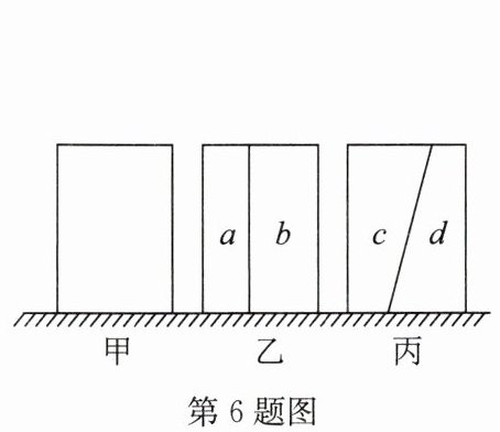 6. 如图甲所示, 一个质量分布均匀的柱体静止在水平面上, 它对水平面的压强为 p. 若将它沿竖直方向切成如图乙的 a、b 两部分, 它们对水平面的压强分别为 $ p_a $ 和 $ p_b $, 则 p、$ p_a $、$ p_b $ 三者的大小关系为